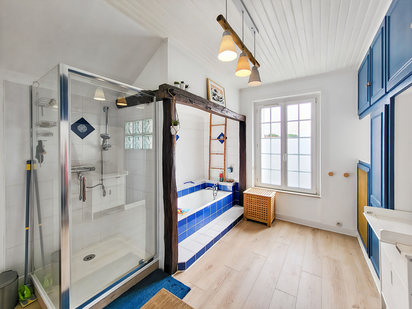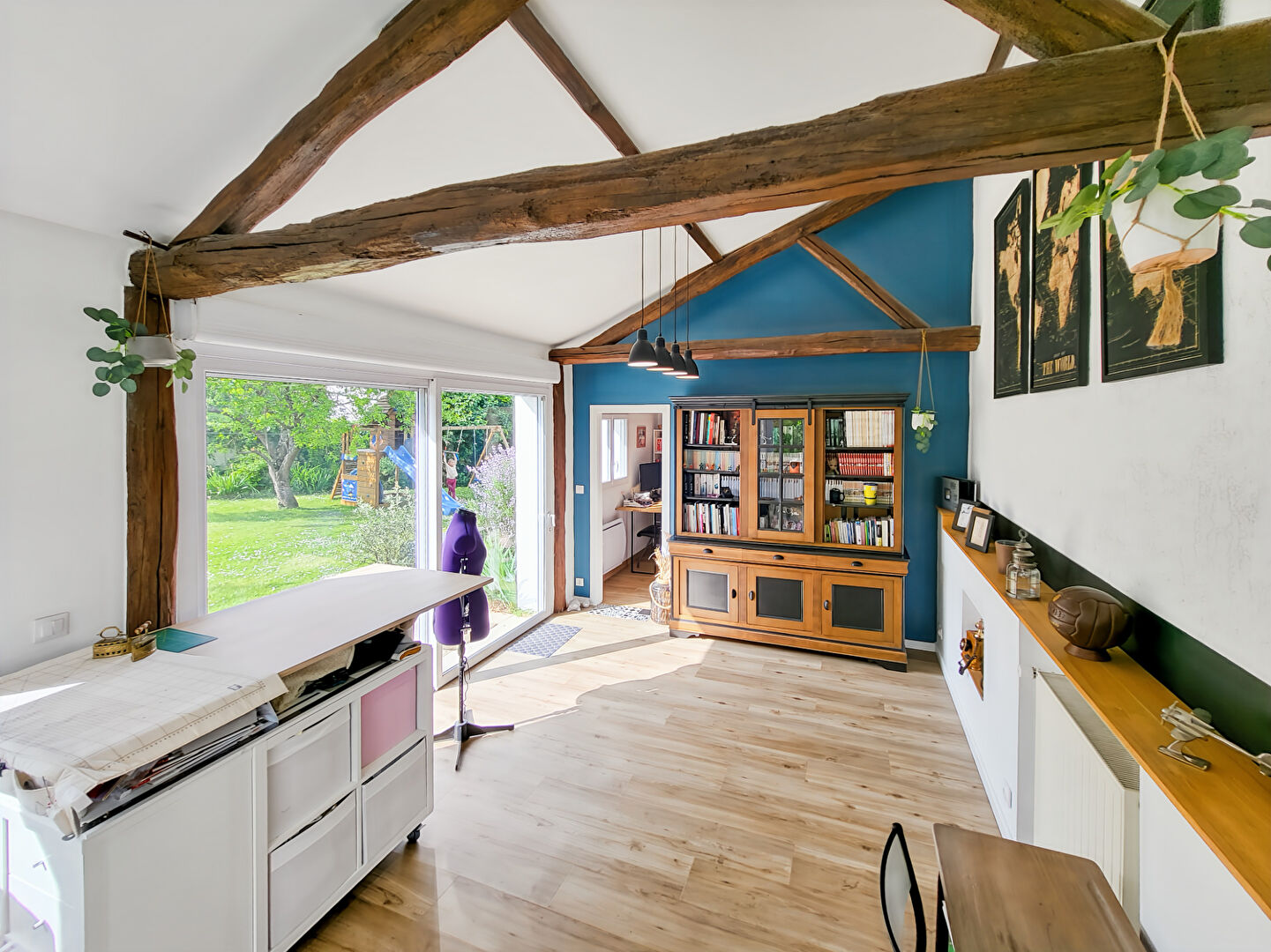 Egalement, une salle de bains spacieuse de 14m² avec douche, deux WC et une magnifique salle de jeu d'environ 23m² en toit cathédrale avec l'accès direct au jardin afin de profiter d'un bain de soleil.