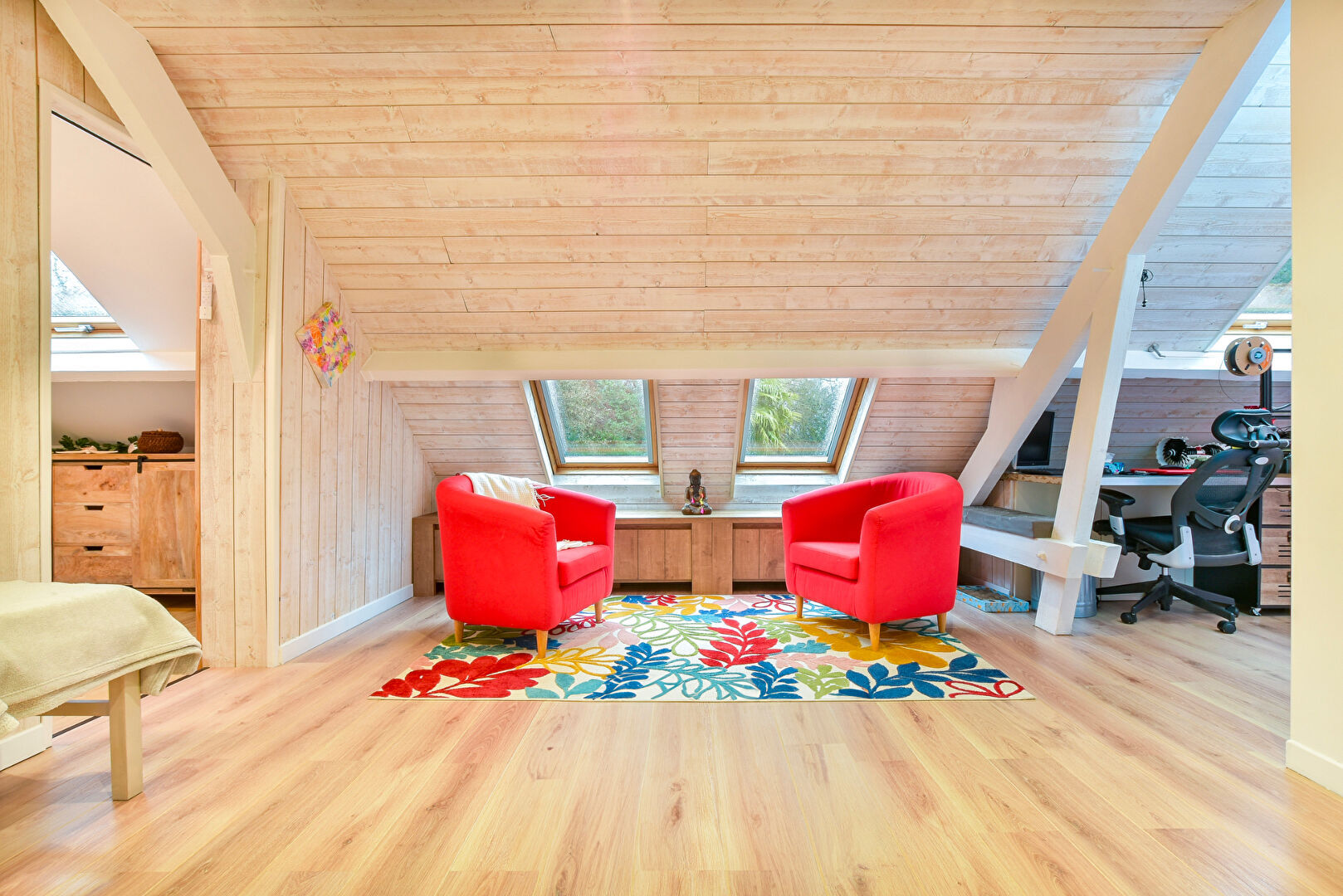 A l'intérieur, vous trouverez une cuisine américaine aménagée et équipée, un séjour , ainsi qu'un poêle à granules pour des soirées chaleureuses.
